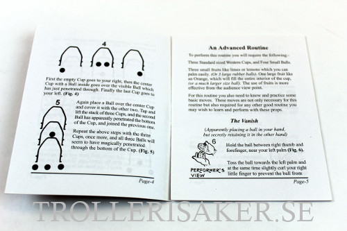 Most Cups & Balls sets come with a basic routine. With our booklet (4" x 5.5", 24 pages, illustrated) - you'll learn many classic Cups & Balls routines such as: the Vanish, False Loading, Real Loading, Secret Loading, and Loading Fruit, live chicks or mice.