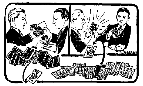 Efter att grundligt ha blandat och kuperat sina resp. lekar, tar konstnären, obesett ur sin lek ett kort och överlämnar det till åskådaren, vilken därefter utför samma manöver med ett kort, vilket som helst, ur sin lek samt insticker detta i konstnärens lek.