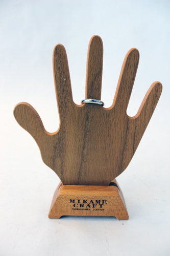 Display a beautiful wooden cut-out hand and an accompanying wooden base.