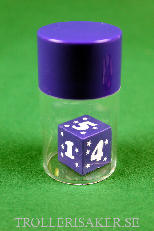 Du visar en transparenrt burk med en stor tärning med siffror på sidorna.